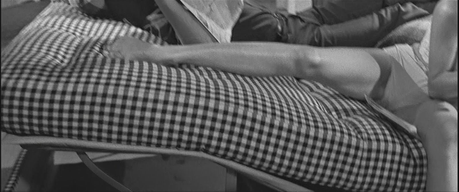 This leads, a few scenes later, to the two of them, post-shower, lounging on an electric daybed. Fuchsberger is on his back, reading the paper. He is at an impasse in the chase for the Hexer. Hardy, barely dressed (in a way that seems like it surely must've been right on the edge, censorship-wise), is reclining at the opposite end, trying to get F.'s attention: